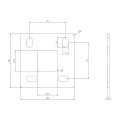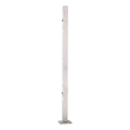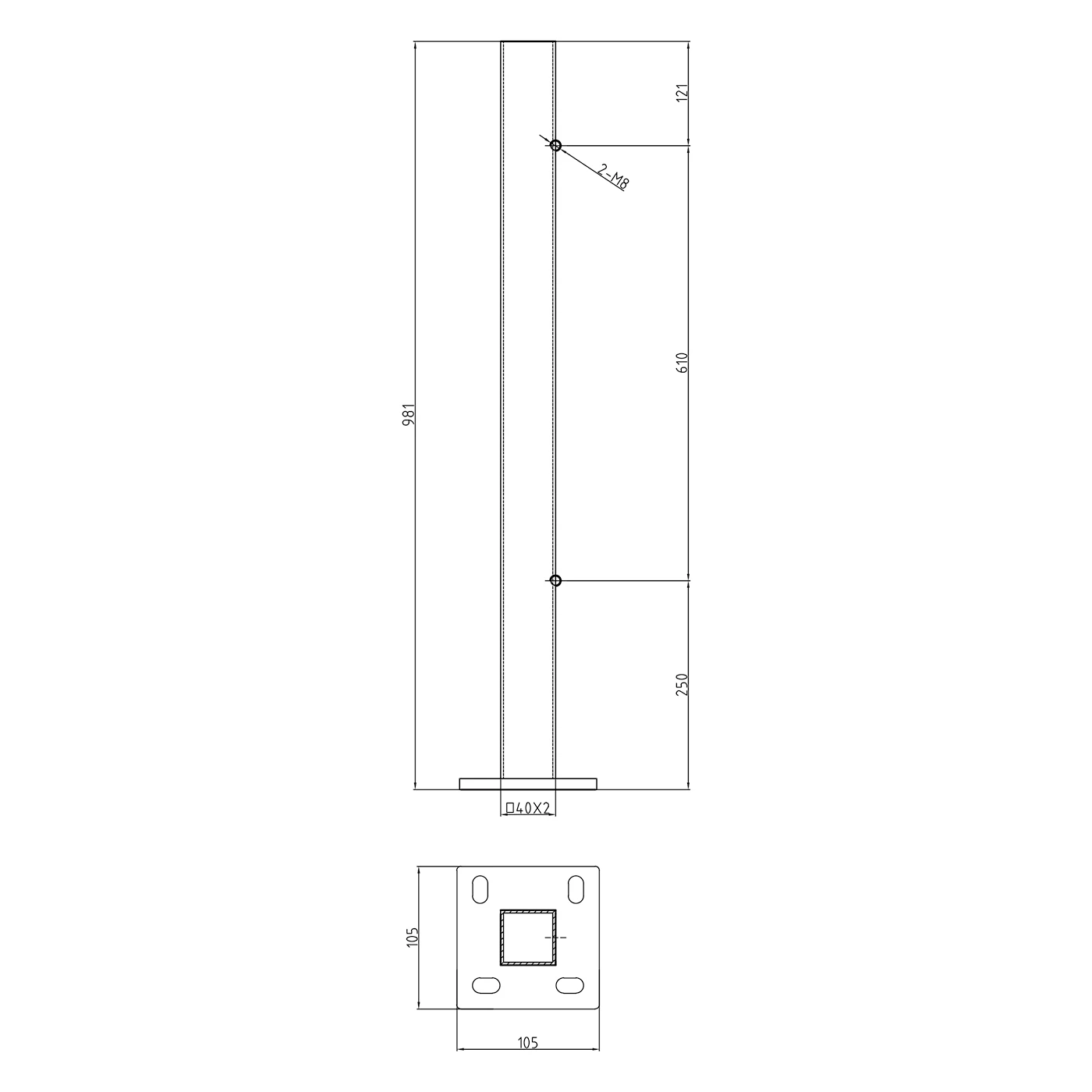 Le poteau est monté directement au sol à l'aide du pied soudé de dimensions 105×105 mm avec quatre trous oblongs. La forme ovale des trous (20×11 mm) permet la correction du positionnement lors du montage. Deux trous filetés M8 répartis sur le poteau avec un entraxe de 610 mm permettent la fixation rapide des supports de traverses de balustrade sans nécessité de perçage ou de filetage sur le chantier.