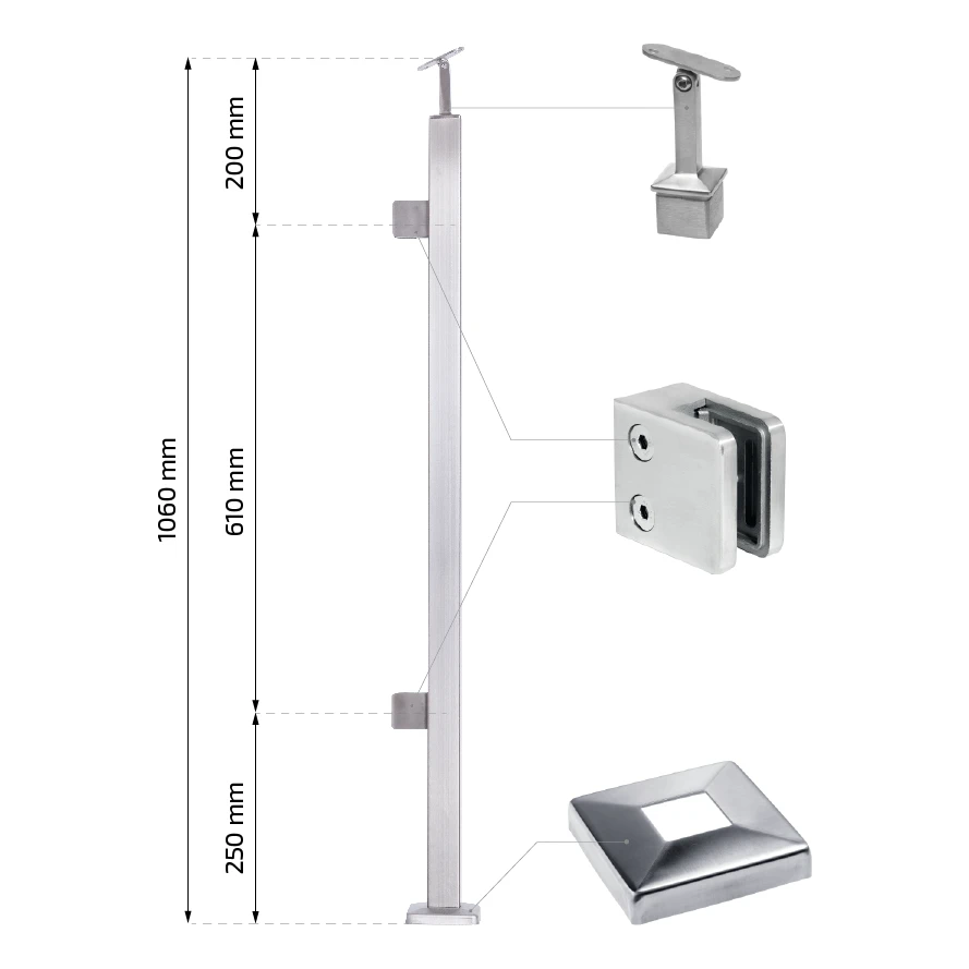 Poteau de balustrade d'extrémité gauche 40x40x1060/1100mm 2 fixations pour verre