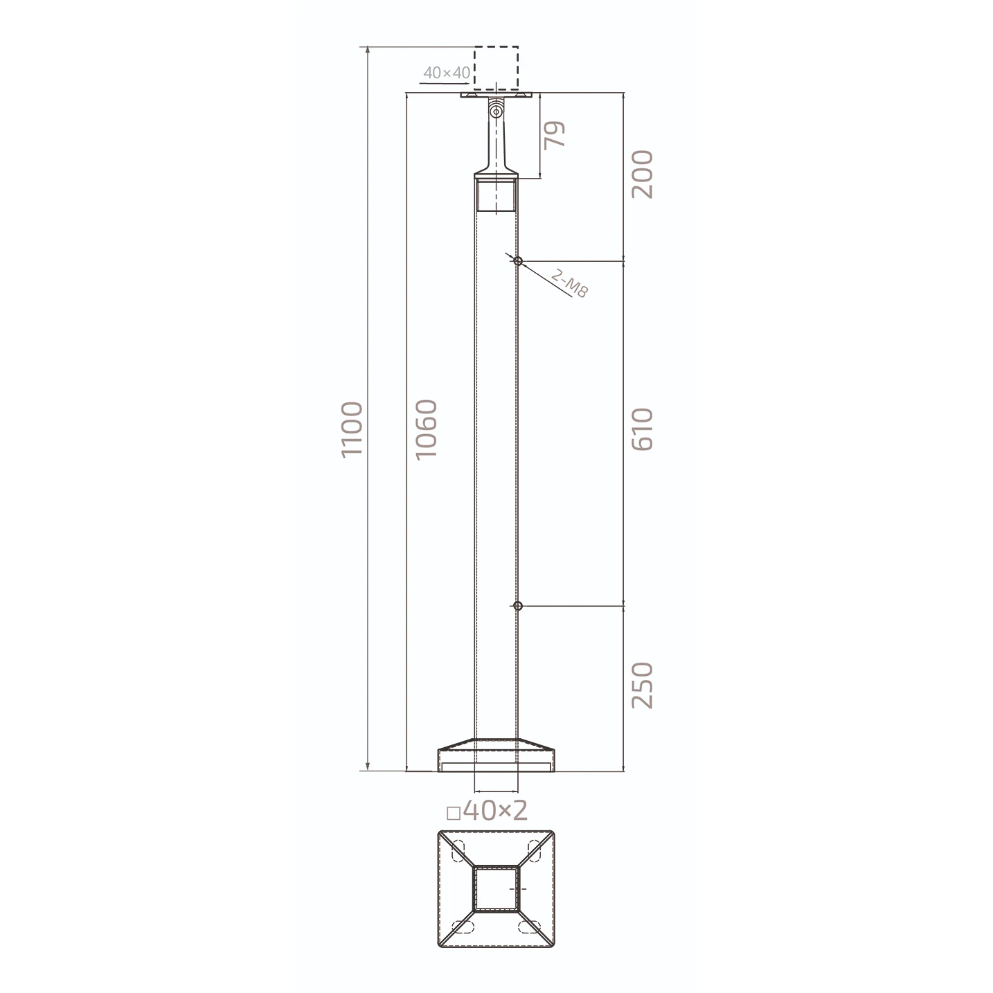 Poteau de balustrade d'extrémité gauche fabriqué en acier inoxydable de haute qualité AISI 304, destiné à la construction de balustrades en verre — de balcon et d'escalier. Le profilé carré 40×40×2 mm avec finition polie couleur satin assure un aspect esthétique et moderne ainsi qu'une haute résistance à la corrosion. Le poteau est livré complet avec les fixations pour verre, le cache-base et le raccord — prêt pour un montage rapide sur chantier.