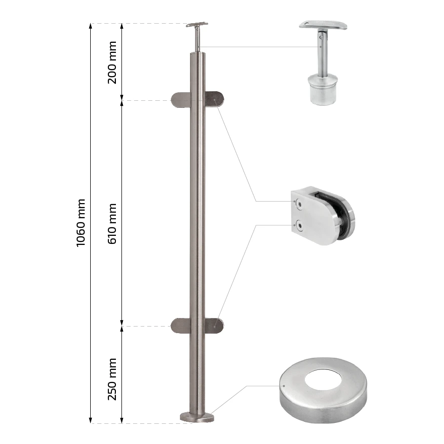 Poteau de balustrade intermédiaire Ø 42,4x1060/1102,4 mm/ 4 supports pour verre