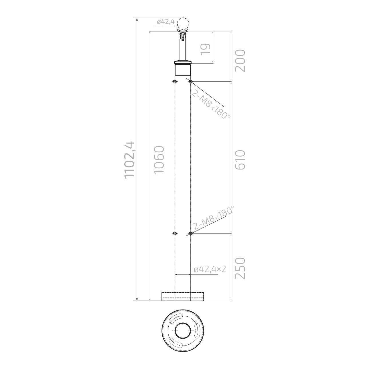 La construction universelle permet l'utilisation dans des balustrades de balcons et d'escaliers. Le support de main courante n'est pas collé de façon permanente — l'installation se fait avec une colle anaérobie pour acier inoxydable. Cette solution facilite l'installation, permet un ajustement libre du positionnement du poteau aux conditions du chantier, et en cas de besoin permet de raccourcir le poteau sans endommager la fixation d'usine. La hauteur totale avec la main courante est de 1102,4 mm, ce qui correspond aux normes de sécurité pour les balustrades.
