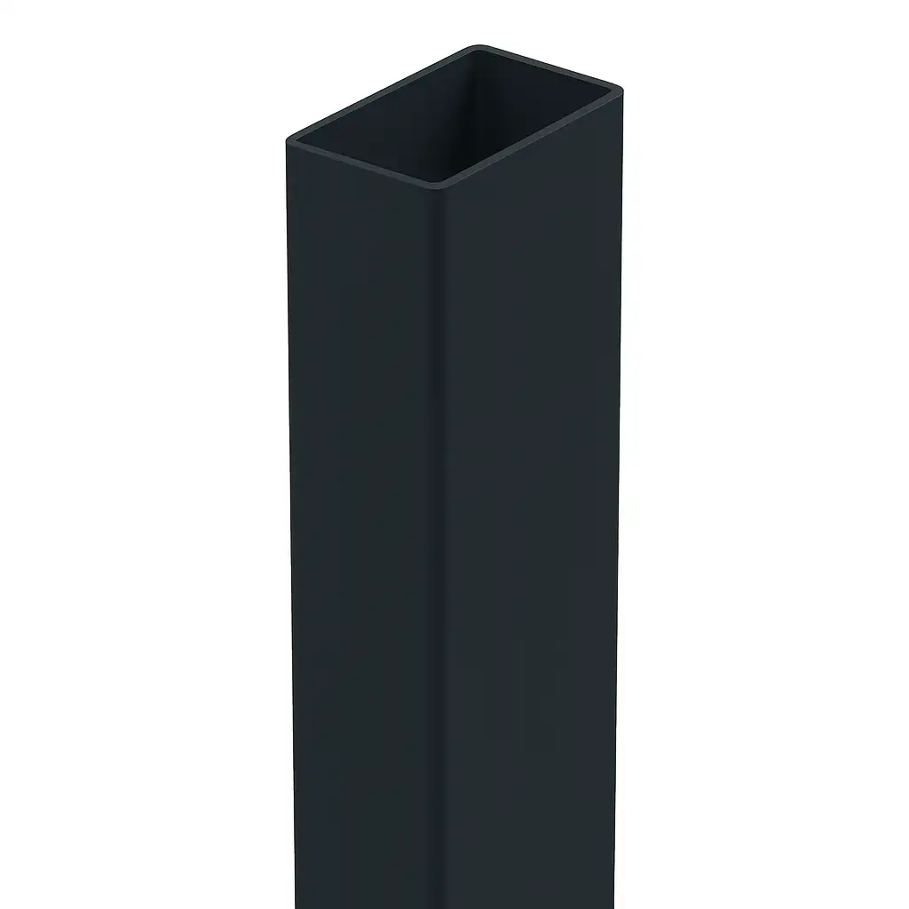 Poteau de clôture 60×40×1,2 mm d'une longueur de 2,0 m en coloris noir RAL 9005, c'est un élément porteur universel destiné à la construction de clôtures à panneaux 3D. Fabriqué à partir d'un profilé rectangulaire en acier et fini par une peinture en poudre, il allie une esthétique soignée à une solide protection anticorrosion.