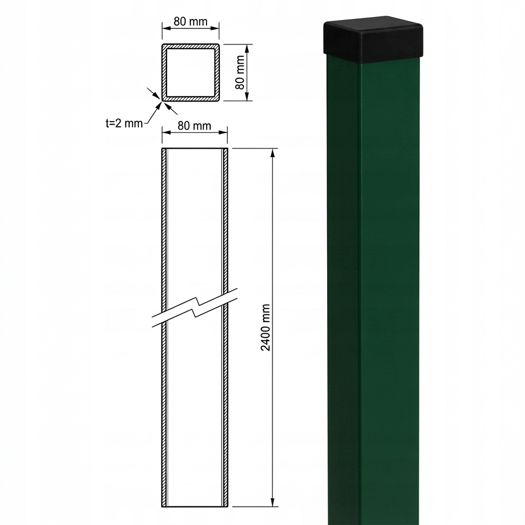 Poteau de clôture en acier 80x80 mm vert RAL 6005 – 240 cm