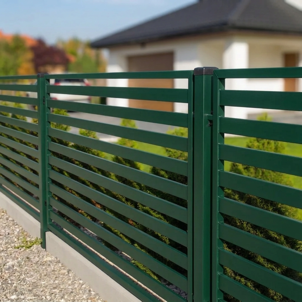 La couleur vert RAL 6005 est l'une des teintes les plus populaires pour les clôtures résidentielles et industrielles. Elle s'harmonise parfaitement avec la végétation du jardin et se fond discrètement dans l'environnement, tout en offrant un aspect élégant et cohérent à l'ensemble de la clôture.