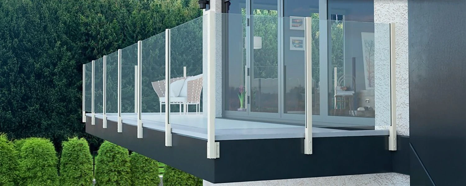 - Montage latéral sur la façade de la dalle ou la volée d'escaliers — dégage la surface du balcon et facilite l'aménagement