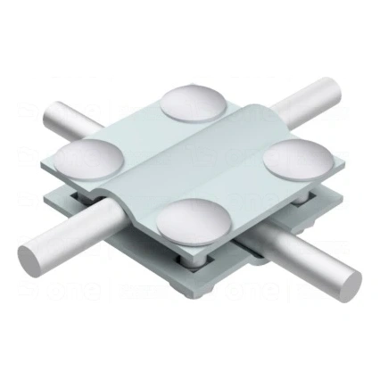 Le raccord en croix à 4 trous et 2 plaques sert à réaliser des connexions croisées permanentes de conducteurs ronds et plats dans les installations de protection contre la foudre. C'est un élément fiable du système de protection paratonnerre, qui convient aussi bien aux toitures qu'aux installations au sol.