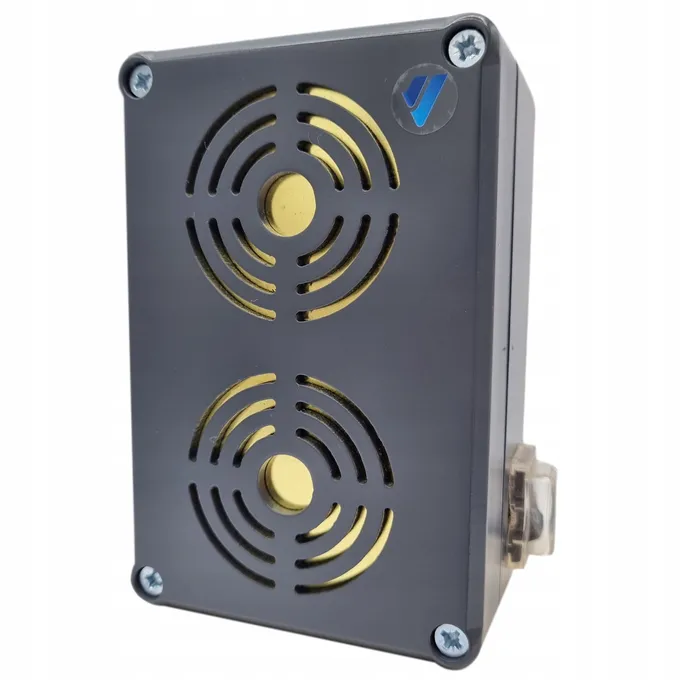 Deux haut-parleurs piézoélectriques Ø50 mm en laiton garantissent une puissance élevée et une longue durabilité. Les grilles de protection préservent les transducteurs des dommages mécaniques, tandis que les joints en silicone et le capuchon de l'interrupteur assurent une étanchéité totale du boîtier.