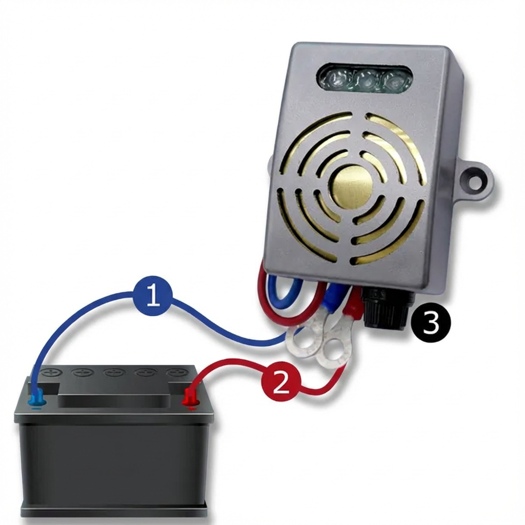 L'installation ne nécessite ni outils spécialisés ni connaissances particulières. Deux câbles de 90 cm terminés par des cosses à œil se connectent directement aux bornes de la batterie. L'ensemble prend littéralement quelques minutes.