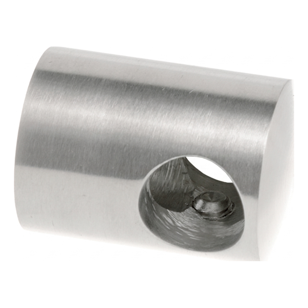 Le support se présente sous la forme d'un corps cylindrique avec un trou traversant par lequel passe la tige ou le tube. La fixation au plan s'effectue par le dessous au moyen d'un trou de montage. Deux vis de serrage latérales permettent de bloquer fermement la tige à l'intérieur du support. Grâce à ses dimensions compactes, l'élément s'harmonise discrètement avec le design moderne des balustrades en acier inoxydable.