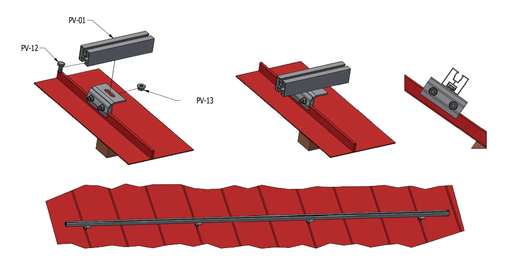 Support de montage pour profilés, installation sur toiture en tôle à joint debout. Permet un montage rapide sans nécessité de localiser les chevrons de toiture et sans intervention dans la structure de la couverture.