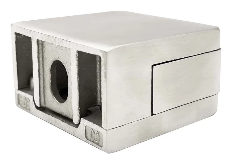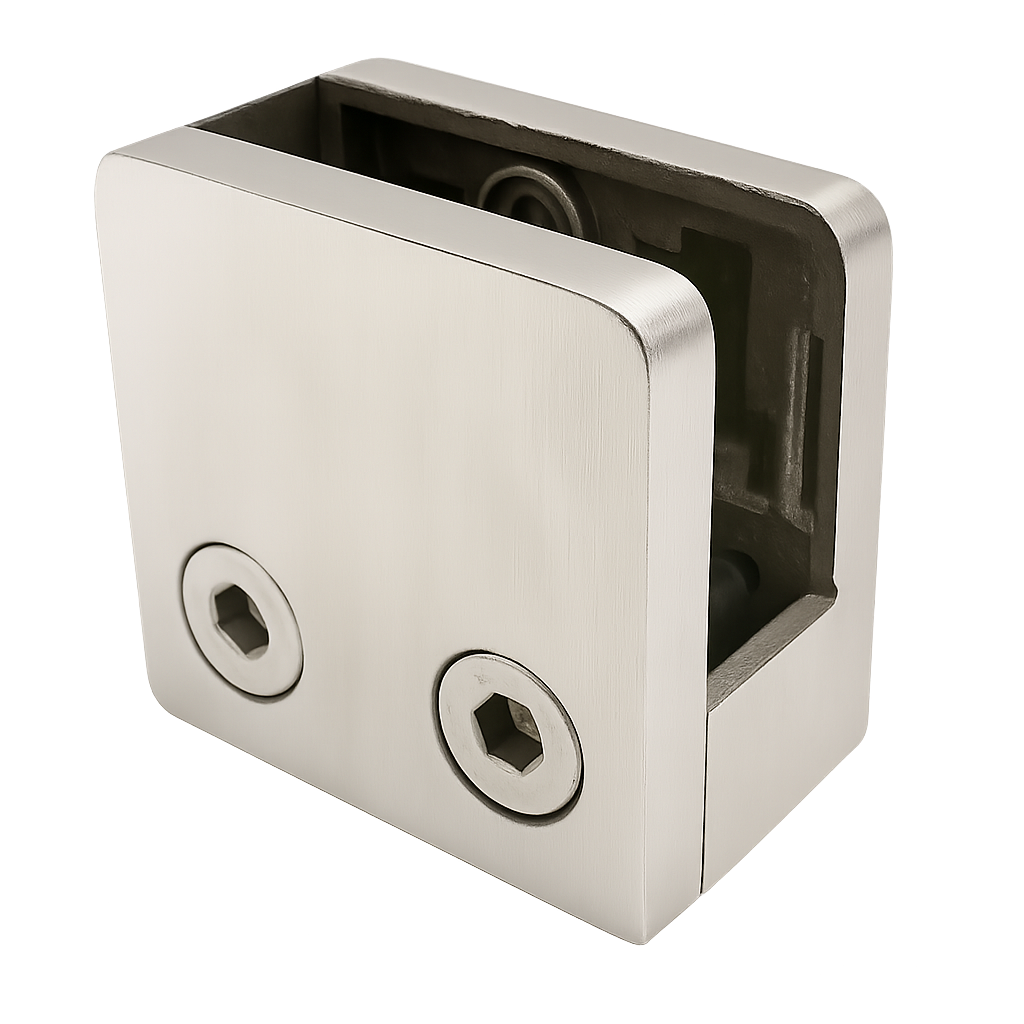 Support rectangulaire pour verre avec console conçu pour la fixation professionnelle de panneaux en verre d'une épaisseur de 6 a 10,76 mm. Fabriqué en acier inoxydable AISI 304 avec finition satinée, il convient parfaitement aux applications ou l'esthétique et la durabilité sont primordiales — garde-corps, cloisons en verre et éléments de finition.