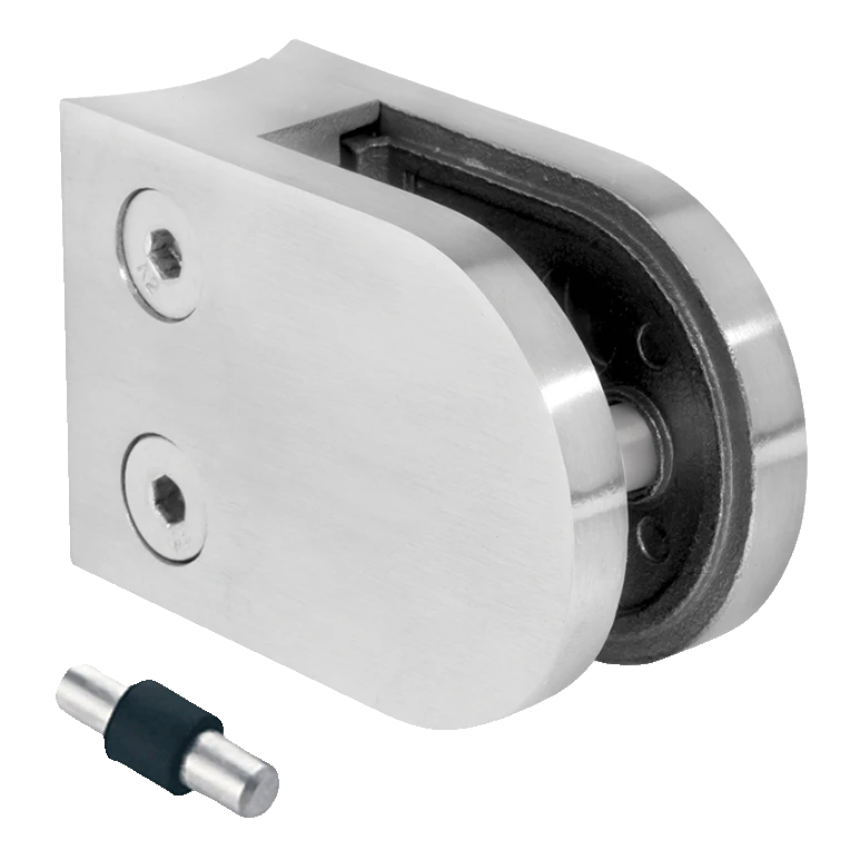Le support est livré avec une goupille de sécurité qui empeche le glissement accidentel du panneau de verre. Le montage s'effectue en vissant le support directement sur le tube porteur — sans soudure ni adaptateur supplémentaire. Les inserts en caoutchouc internes protegent les bords du verre contre les rayures et compensent les tolérances d'épaisseur des panneaux dans la plage 6–10,76 mm.