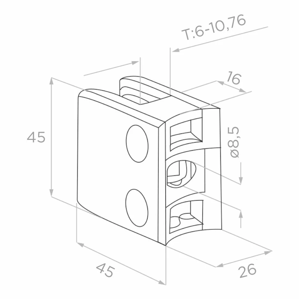 Support de verre rectangulaire 45×45×26 mm en acier inoxydable AISI 316 avec finition satinée. Conçu pour un montage sur tube de diamètre Ø42,4 mm, il s'intègre parfaitement dans les systèmes de garde-corps en verre, aussi bien en intérieur qu'en extérieur. La construction à vissage assure une fixation solide et durable sur le poteau.