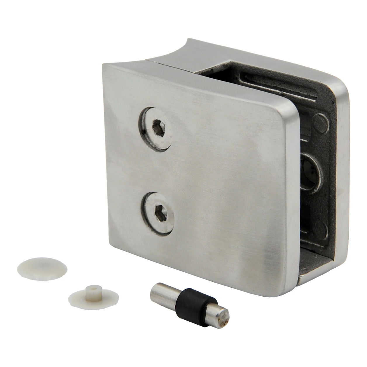 Le support est livré avec une goupille de sécurité et des capuchons décoratifs pour les vis. Deux vis à six pans creux permettent un réglage précis de la pression sur le verre sans démontage complet du support — ce qui représente un gain de temps lors de l'installation et de la maintenance. Le dos arrondi de la console s'adapte parfaitement au tube de 42,4 mm de diamètre, garantissant une fixation stable et sûre.