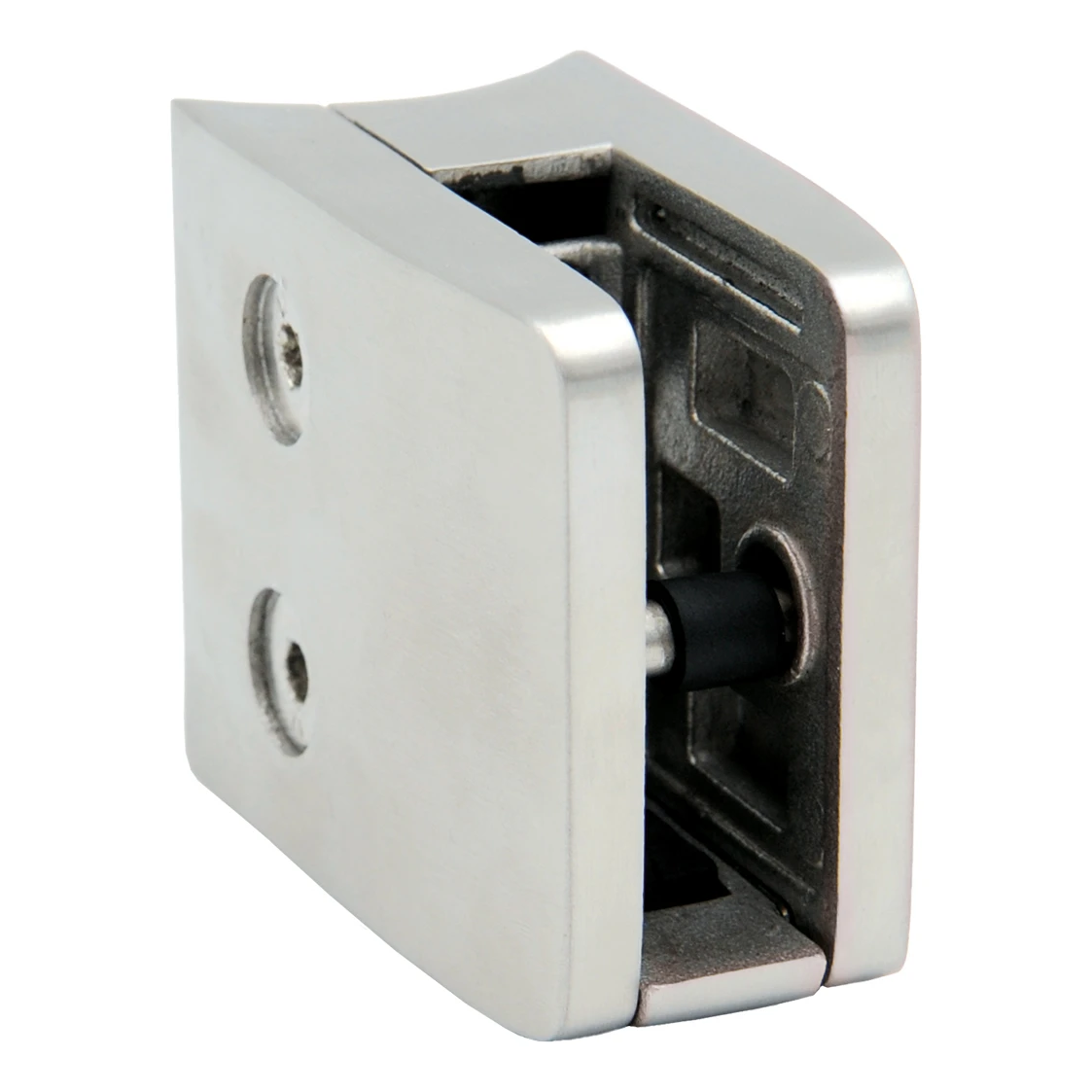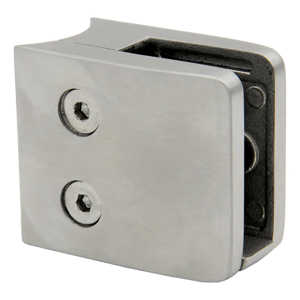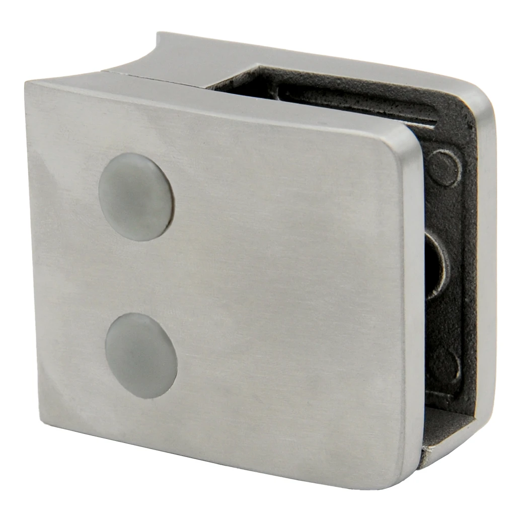 Support de verre rectangulaire avec console et goupille de sécurité, conçu pour la fixation professionnelle de panneaux en verre sur des tubes d'un diamètre de 42,4 mm. Fabriqué en acier inoxydable AISI 304 avec finition satinée — il offre un aspect esthétique et moderne ainsi qu'une haute résistance à la corrosion, ce qui le rend adapté aussi bien aux installations intérieures qu'extérieures.