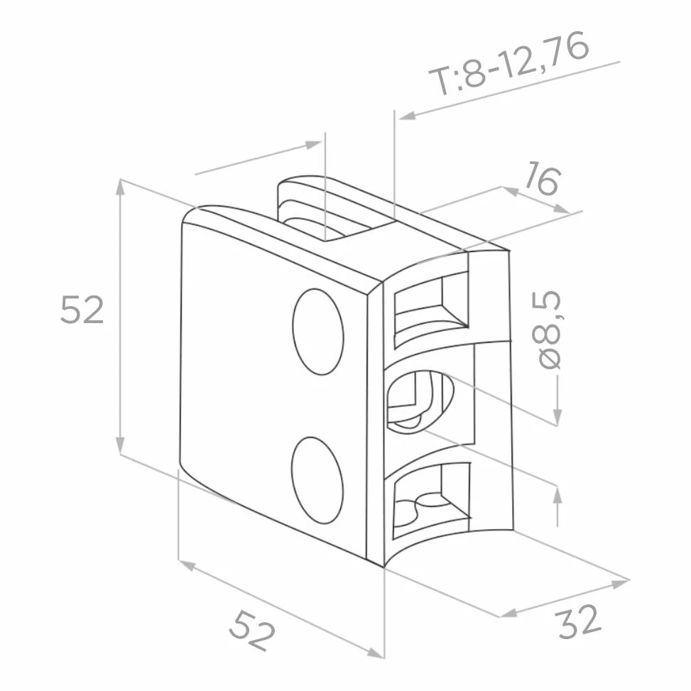 Support de verre 8-12,76 mm 52x52x32 mm console et pin AISI 304 système 42,4 mm satiné