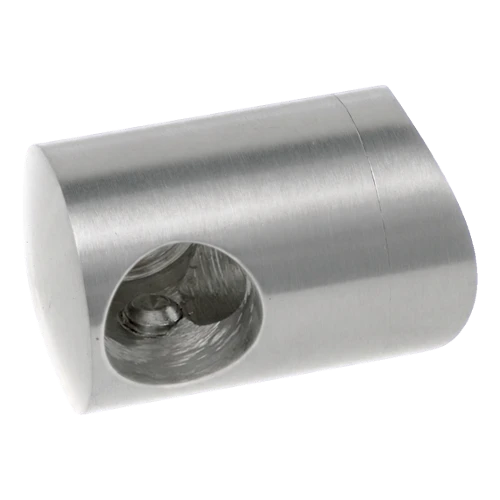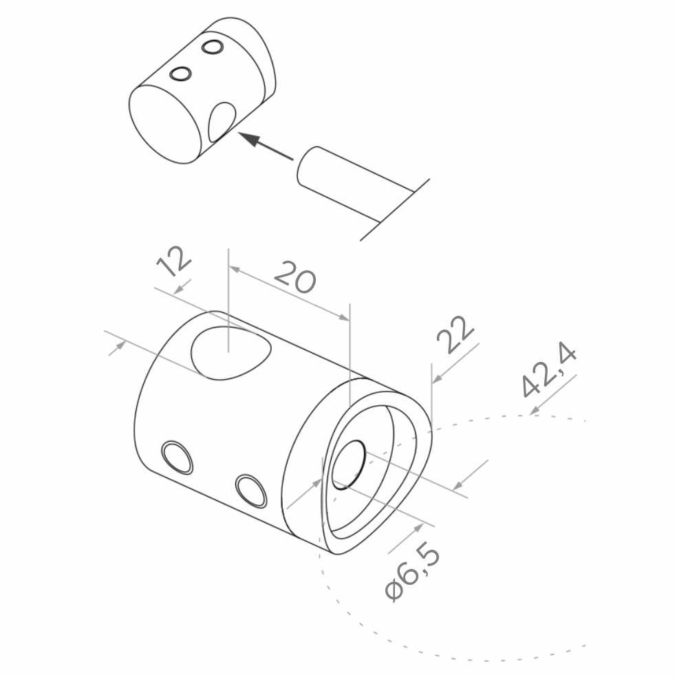Le corps cylindrique possède un perçage traversant pour tige fi 12 mm, deux perçages pour vis de serrage permettant un blocage sûr de la tige ainsi qu'un perçage de montage central fi 6,5 mm pour la fixation sur le poteau. La base profilée en arc s'adapte parfaitement à la courbure du tube fi 42,4 mm, ce qui assure un contact stable et étanche sans nécessité d'usinage supplémentaire.