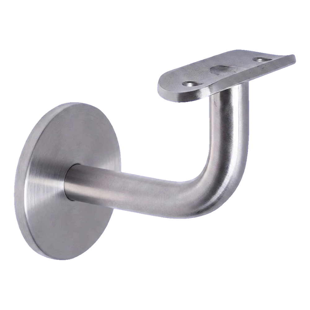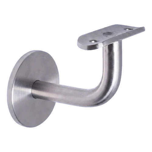 Le support se compose d'une rosace ronde fixée au mur, d'un bras porteur cintré et d'une plaque de montage (selle) permettant de visser le tube de main courante. La plaque de montage avec un trou de montage est incluse dans le kit. Les vis de fixation murale ne sont pas comprises dans l'ensemble — choisissez-les selon le type de support (béton, brique, plaque de plâtre).