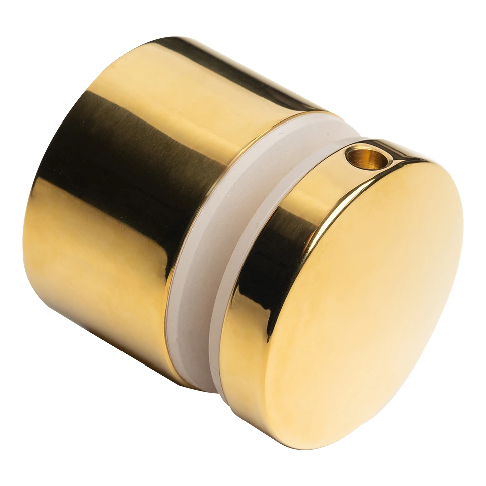 Support ponctuel doré pour verre Ø50 mm en acier inoxydable AISI 304 avec revêtement PVD brillant — élément de fixation professionnel pour panneaux de verre d'épaisseur 8 à 21,52 mm. Destiné au montage sur surfaces planes, il assure une fixation stable et esthétique du verre tant à l'intérieur du bâtiment qu'à l'extérieur.