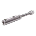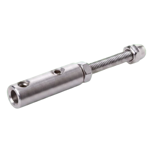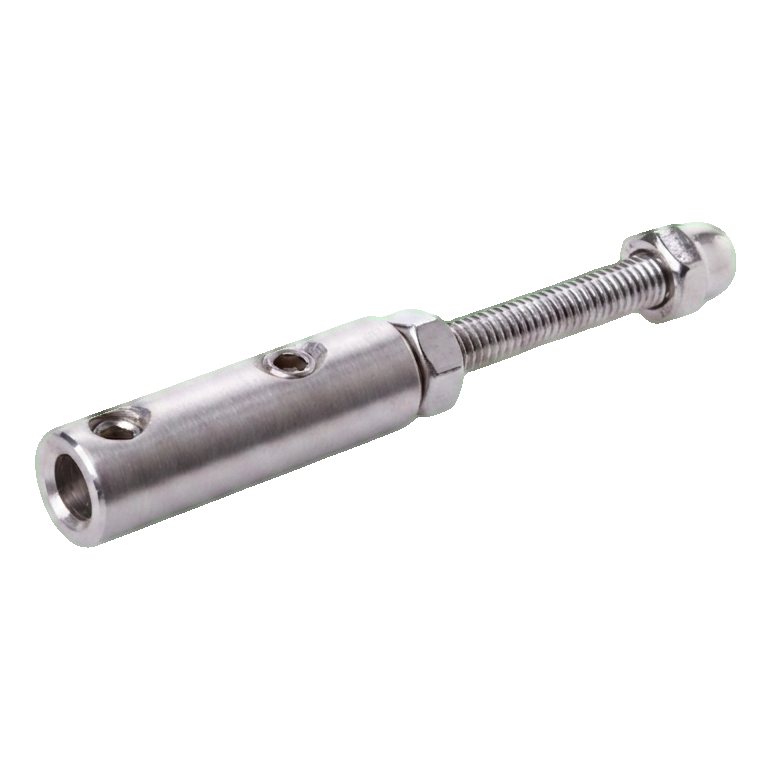 Entièrement fabriqué en acier inoxydable AISI 304 avec finition satinée, le support assure une résistance durable à la corrosion ainsi qu'un aspect esthétique mat qui s'harmonise parfaitement avec les balustrades modernes. Le montage s'effectue par vissage avec une tige filetée M6×50 au support, et le câble est bloqué par des vis de serrage sur filetage M5, permettant un réglage précis et une fixation sûre du câble.