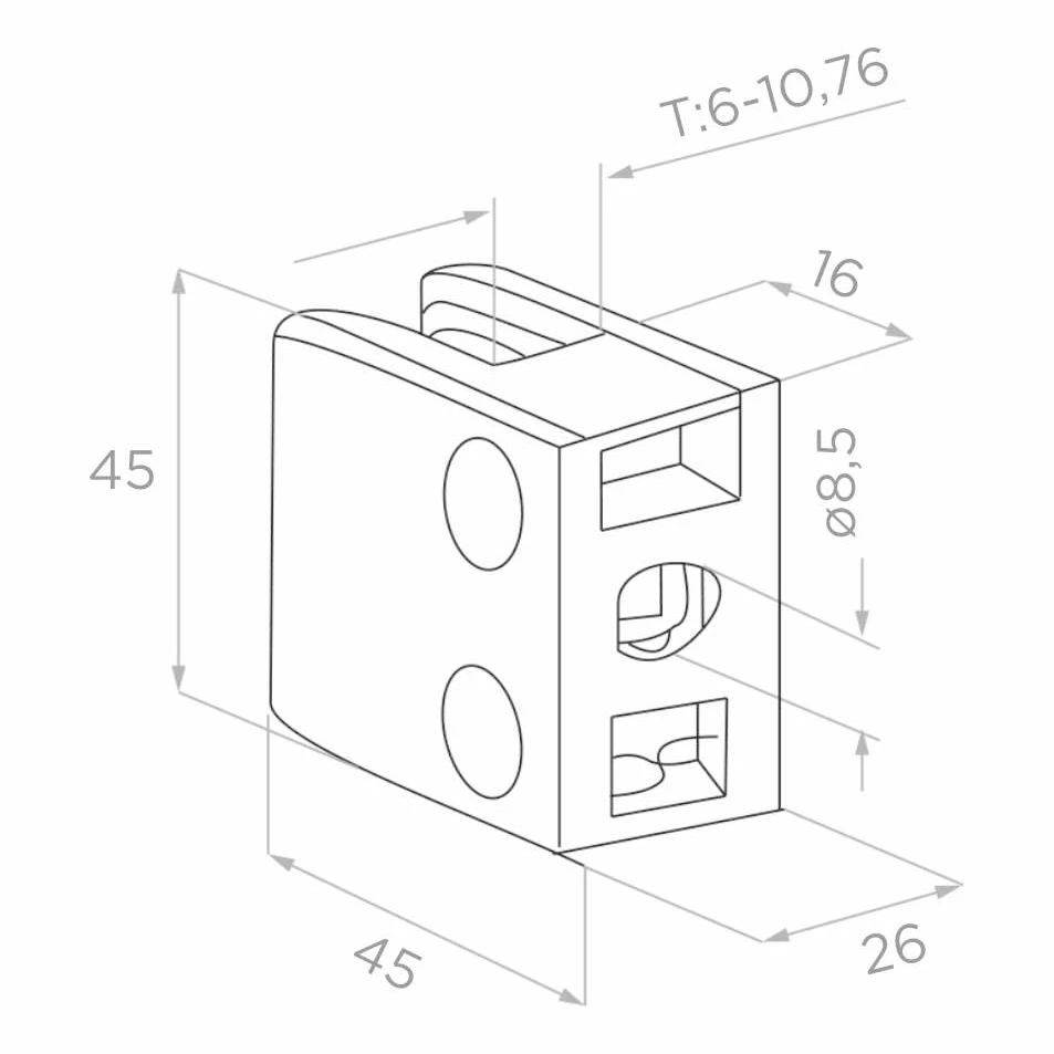 Fabriquée en zamak — alliage de zinc a haute résistance mécanique et excellente coulabilité. La surface brute permet une finition ultérieure adaptée aux exigences de chaque projet. La construction compacte aux dimensions 45×45×26 mm assure une installation discrete, tandis que deux trous de fixation d'un diametre de O8,5 mm garantissent une fixation stable au support.