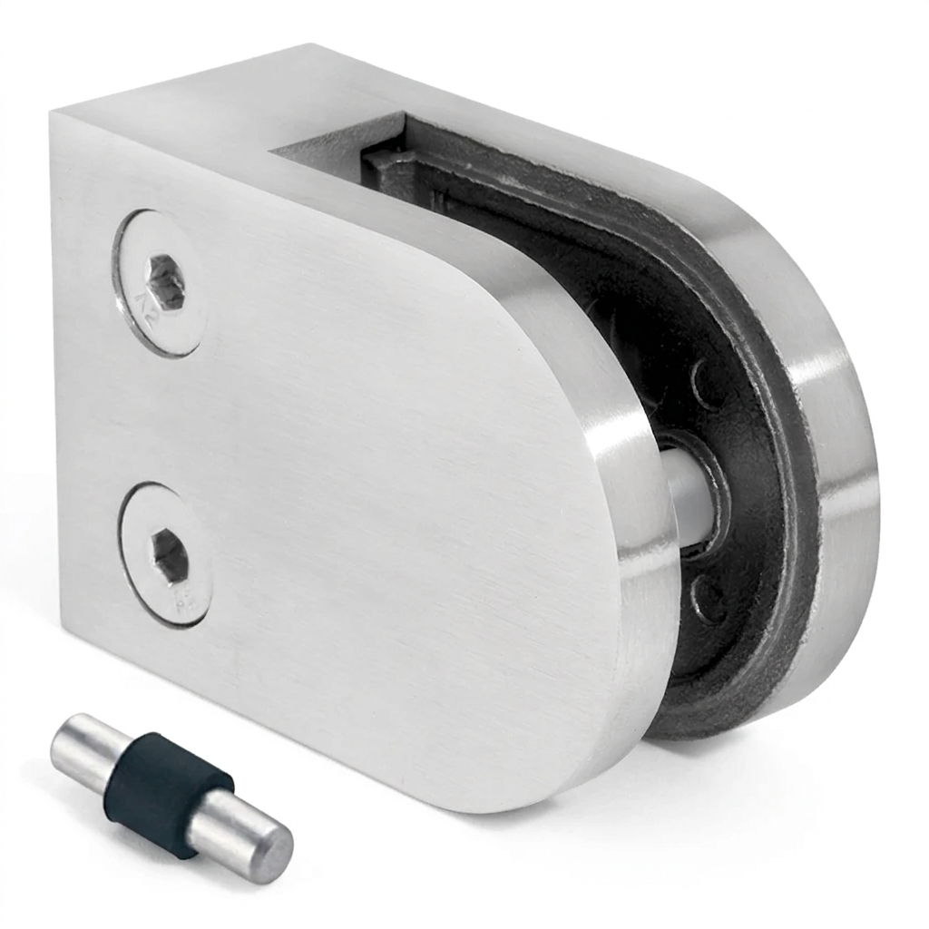 Le corps du support est fabriqué en acier inoxydable AISI 304 — un alliage résistant à la corrosion, adapté aussi bien aux applications intérieures qu'extérieures. La finition polie (miroir) lui confère un aspect élégant, en parfaite harmonie avec les aménagements modernes intégrant du verre. Le joint en caoutchouc intérieur assure un maintien sûr du verre sans risque de rayures. Deux vis à six pans creux permettent un réglage précis de la pression de serrage — sans avoir à démonter l'ensemble du support, ce qui accélère considérablement les travaux de montage et les éventuelles corrections sur chantier.