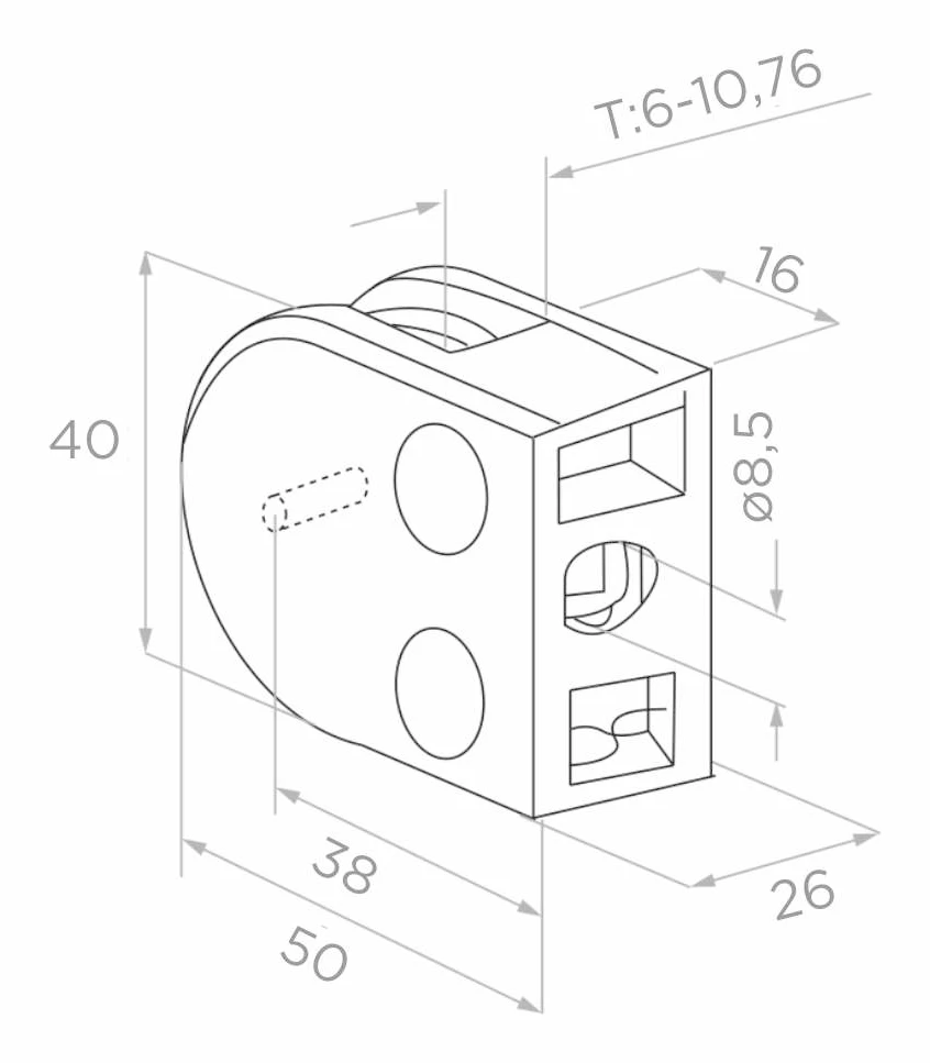 Support pour verre 6-10,76 mm 50x40x26 mm pin AISI 304 système plat poli