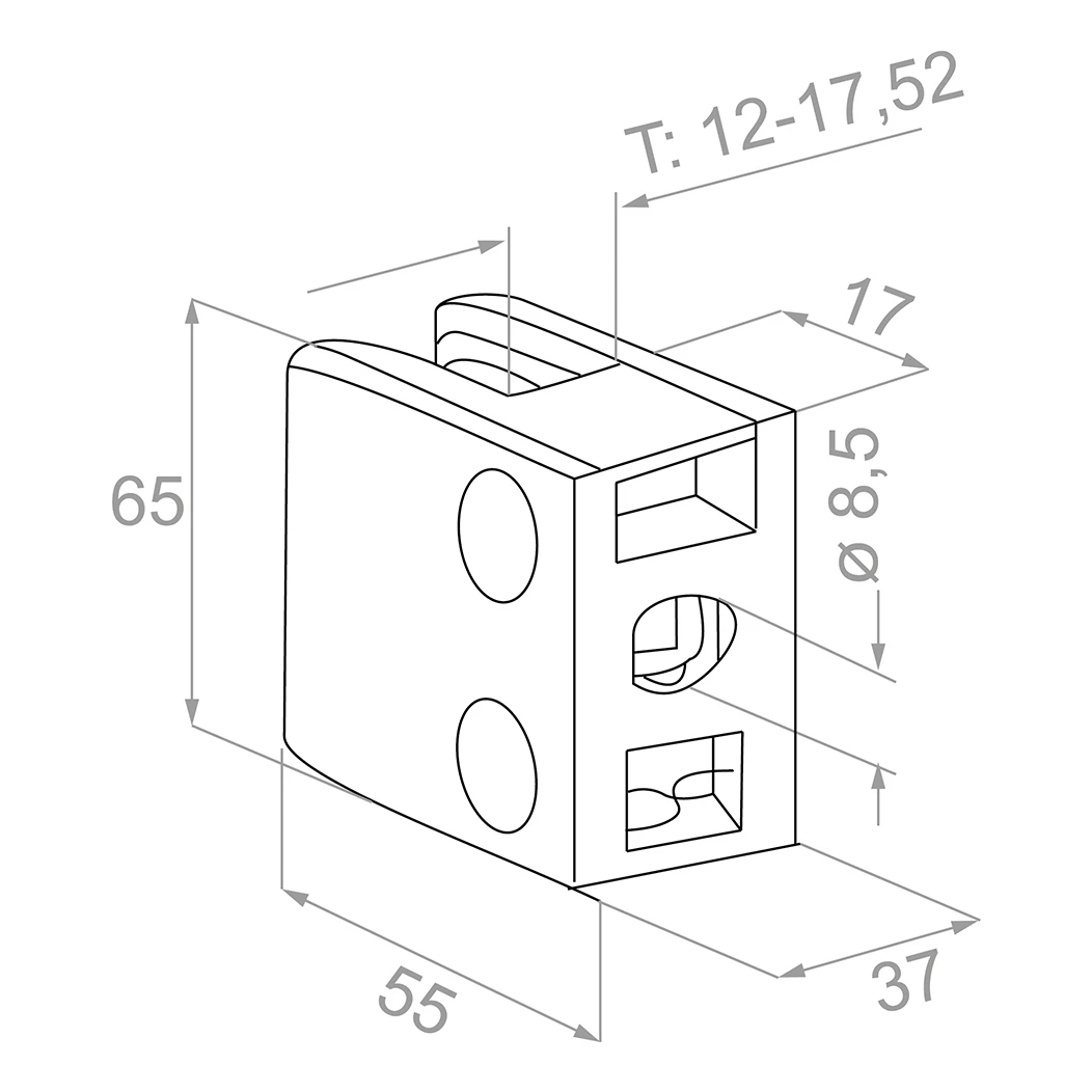 Support de verre rectangulaire 65 × 55 × 37 mm avec goupille de sécurité et console — une solution robuste pour le maintien de panneaux en verre d'une épaisseur de 12 à 17,52 mm. Fabriqué en acier inoxydable AISI 304 avec une finition satinée, il allie une haute résistance à la corrosion à un aspect élégant et discret. La construction compacte assure un serrage stable du verre, tandis que la goupille de sécurité incluse minimise efficacement le risque de glissement accidentel du panneau.