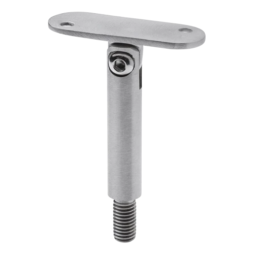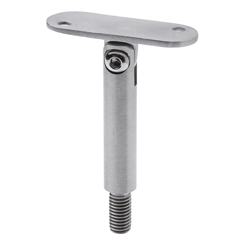 Support articulé de main courante avec plaque de montage plate, destiné aux balustrades en acier inoxydable dans le système plat. La tige articulée permet le réglage de l'angle d'inclinaison de la main courante, ce qui est particulièrement utile lors du montage de balustrades d'escalier — elle permet de régler précisément la pente de la main courante adaptée à la volée d'escalier.