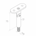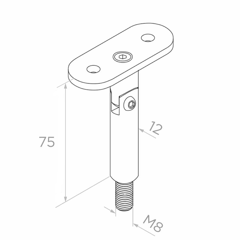 La partie inférieure de la tige se termine par un filetage extérieur M8, permettant de visser le support directement dans le poteau de balustrade. La plaque de montage plate supérieure avec deux trous sert à visser la main courante. L'articulation entre la tige et la plaque assure une liberté totale de réglage de l'angle, permettant à un seul type de support de gérer aussi bien les sections droites qu'inclinées.