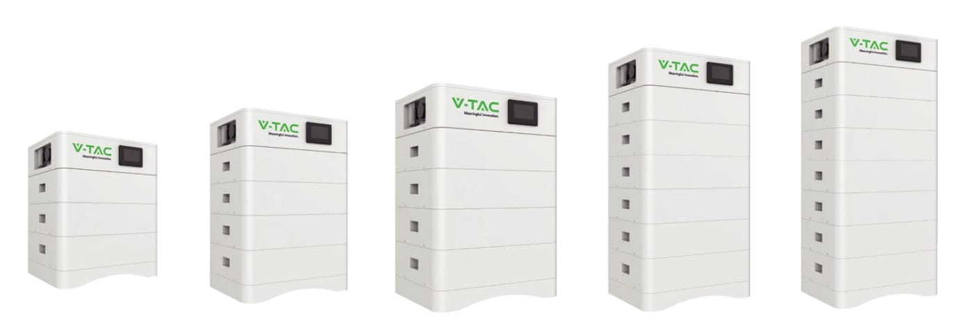 Stockage d'énergie modulaire haute tension V-TAC OHS35K-100 d'une capacité de 35,84 kWh. Base + (7*5,12kWh) VT-OH-5K LiFePO4 5,12V 100Ah modules de batterie + module de contrôle BMS avec câblage inclus.