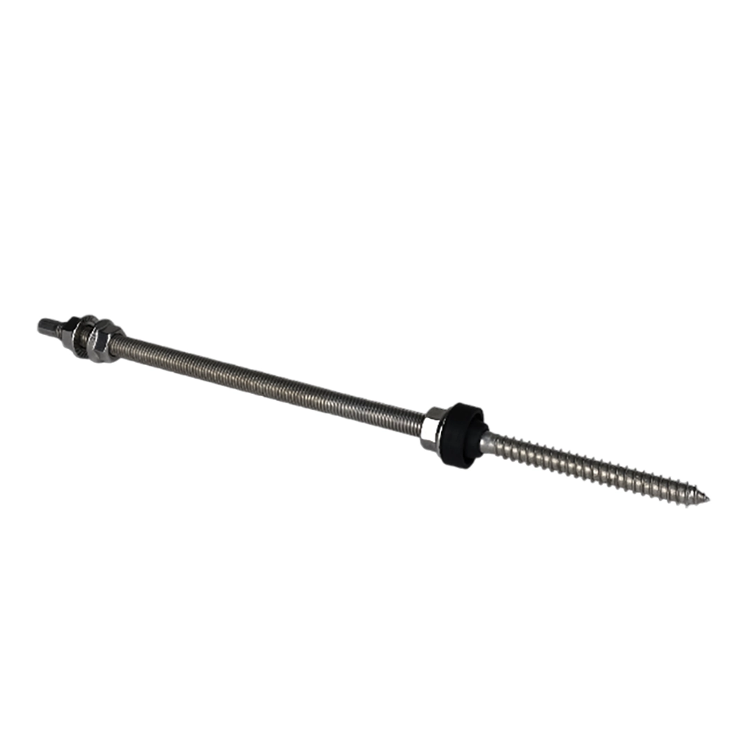 vis à double filetage, l'un des nombreux composants nécessaires à l'installation d'équipements photovoltaïques. Le produit est installé sur les toitures, les tôles, les bardeaux ou le feutre. L'élément se caractérise par deux brins différents à chaque extrémité. L'extrémité filetée est vissée directement à la structure en bois du toit. L'autre extrémité est utilisée pour fixer des adaptateurs avec des écrous à bride.
