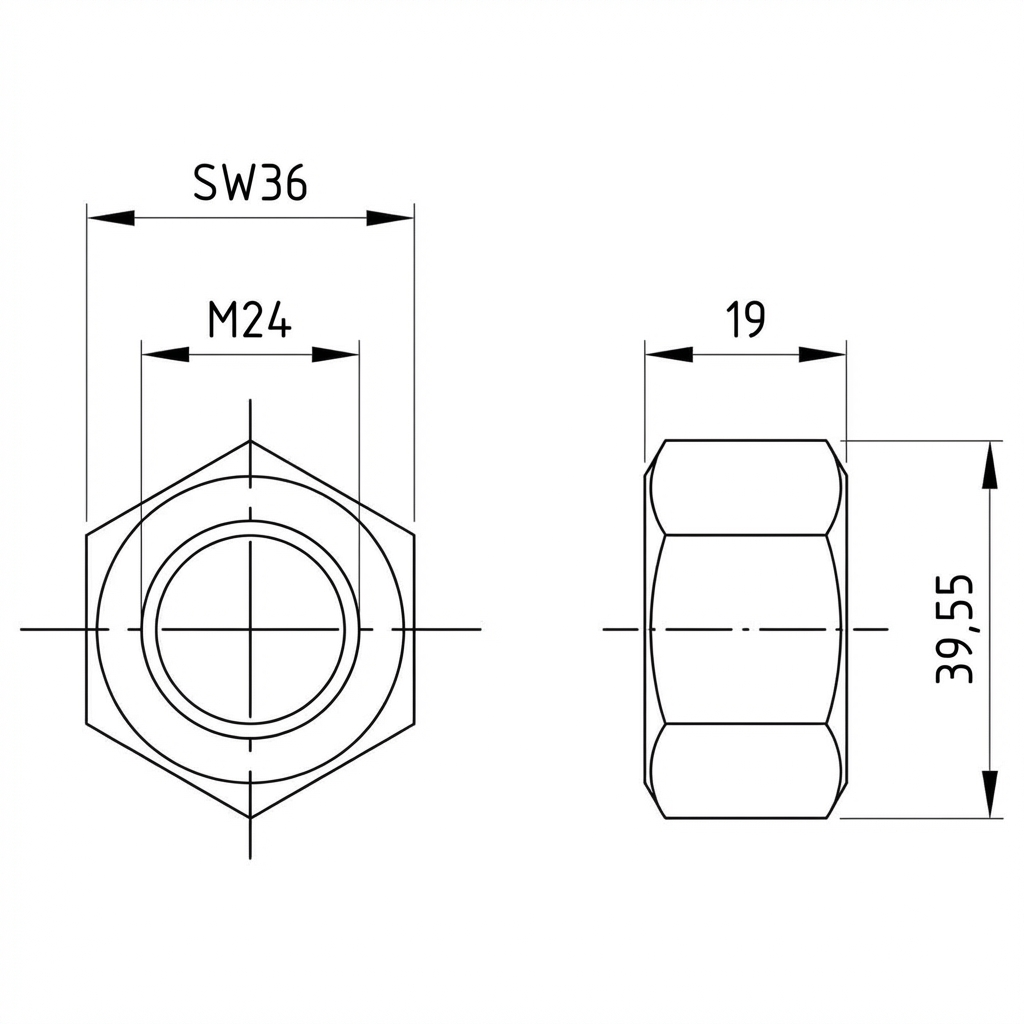 Conformiteit met norm DIN 934 betekent een gestandaardiseerde zeskantige vorm, die eenvoudig aandraaien met een standaard sleutel mogelijk maakt. De moer is herbruikbaar en past op alle metrische M24 bouten met rechtse schroefdraad.