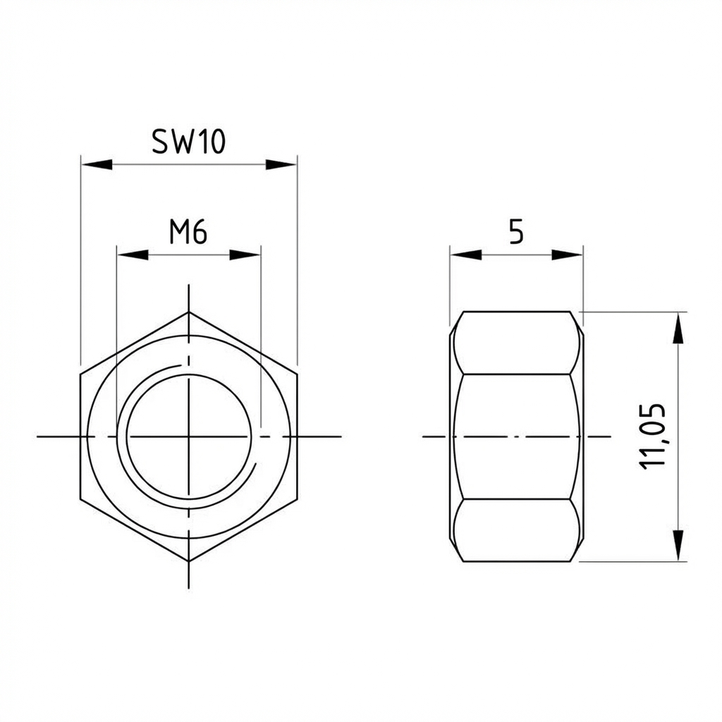 La conformité à la norme DIN 934 signifie une forme hexagonale standardisée qui permet un serrage facile avec n'importe quelle clé standard. L'écrou est réutilisable et s'adapte à toutes les vis métriques M6 avec filetage à droite.