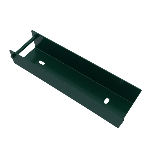 Het product is gemaakt van gegalvaniseerd staal bedekt met poedercoating in groene kleur RAL 6005. Dubbele corrosiebescherming — galvanisatie plus poedercoating — zorgt voor jarenlange weerstand tegen weersomstandigheden, vocht en corrosie, waardoor onderhoud overbodig wordt. De esthetische afwerking harmonieert perfect met moderne panelomheiningen.