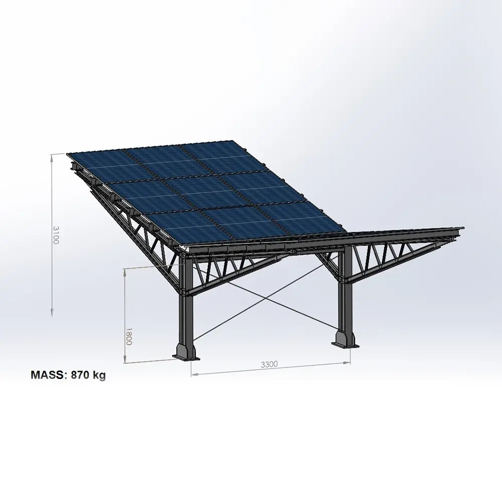 Het is mogelijk om de schuur in een andere maat te maken volgens jouw richtlijnen. Neem contact met ons op en ons team maakt een offerte voor uw fotovoltaïsche schuur volgens uw richtlijnen en behoeften.