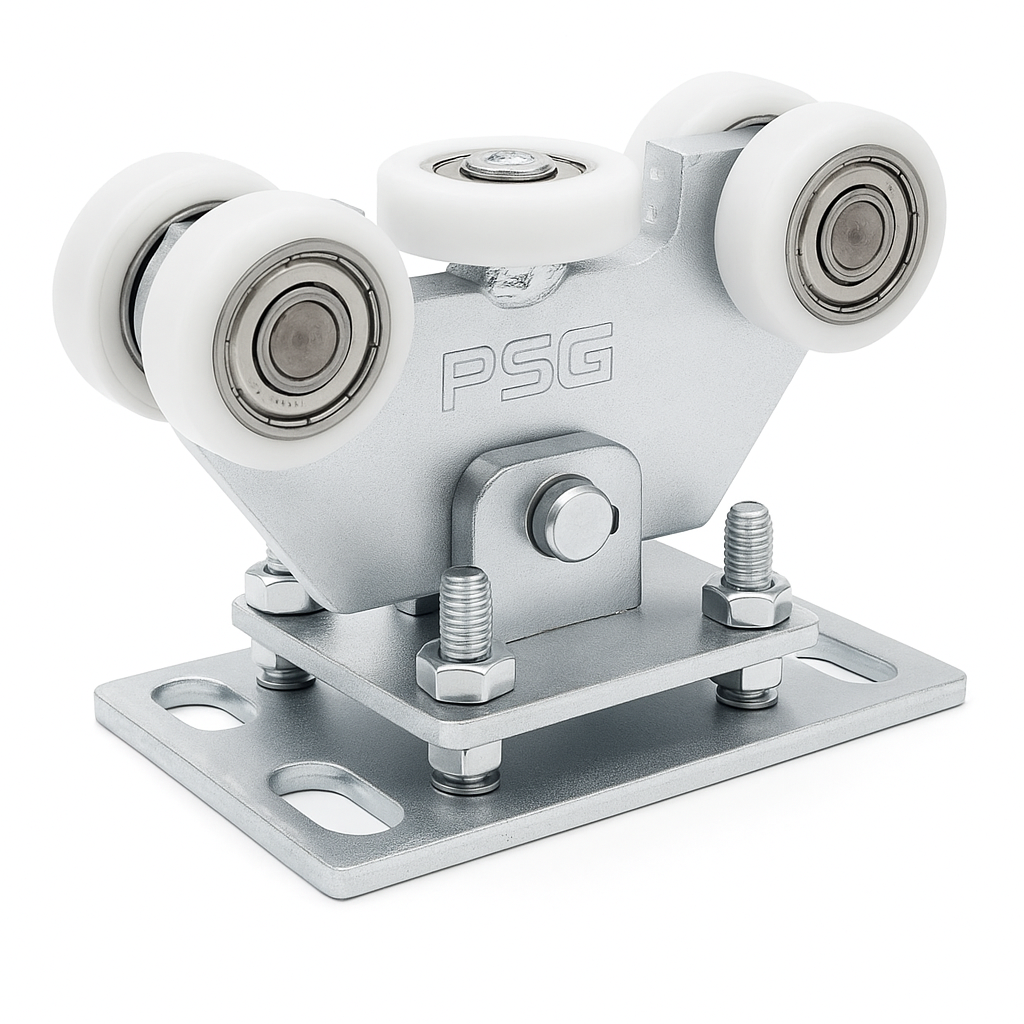 Le chariot roulant 70 est un élément de roulement robuste à 5 galets, conçu pour les portails coulissants autoportants. La construction oscillante avec pivot permet un ajustement automatique au rail de guidage, ce qui élimine les contraintes et assure un fonctionnement fluide du portail même sous de fortes charges – une solution idéale pour les installateurs à la recherche de composants fiables pour les systèmes de portails.