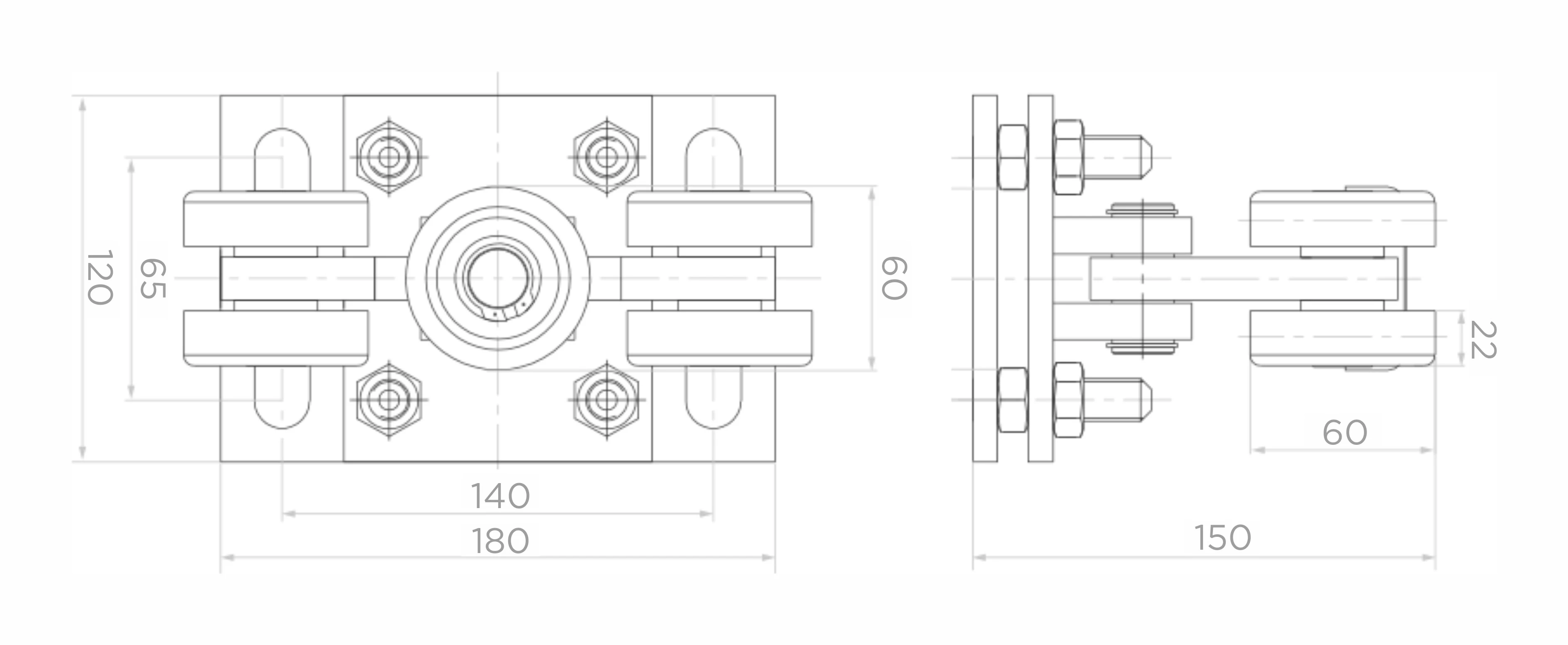 Le chariot oscillant constitue un élément clé du système de portails coulissants autoportants. Le montage sur fondation s'effectue à l'aide de boulons avec écrous à travers les trous oblongs de la base, qui permettent un réglage précis de la position du chariot par rapport à l'axe du rail. Le réglage en hauteur permet un nivellement parfait du portail après la pose.