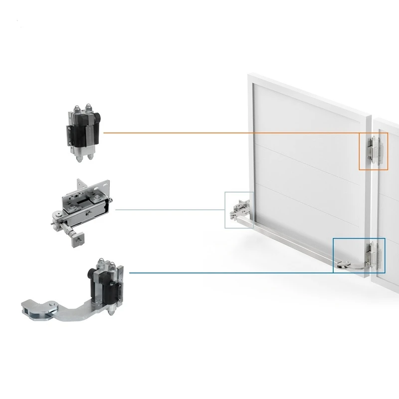 - Onderste scharnier met tandwieloverbrenging en arm — gemonteerd in het onderste deel van de poortvleugel, verantwoordelijk voor de vouwing; dubbelzijdig vouwbare transmissiearm verbindt met de onderkant van de eerste vleugel