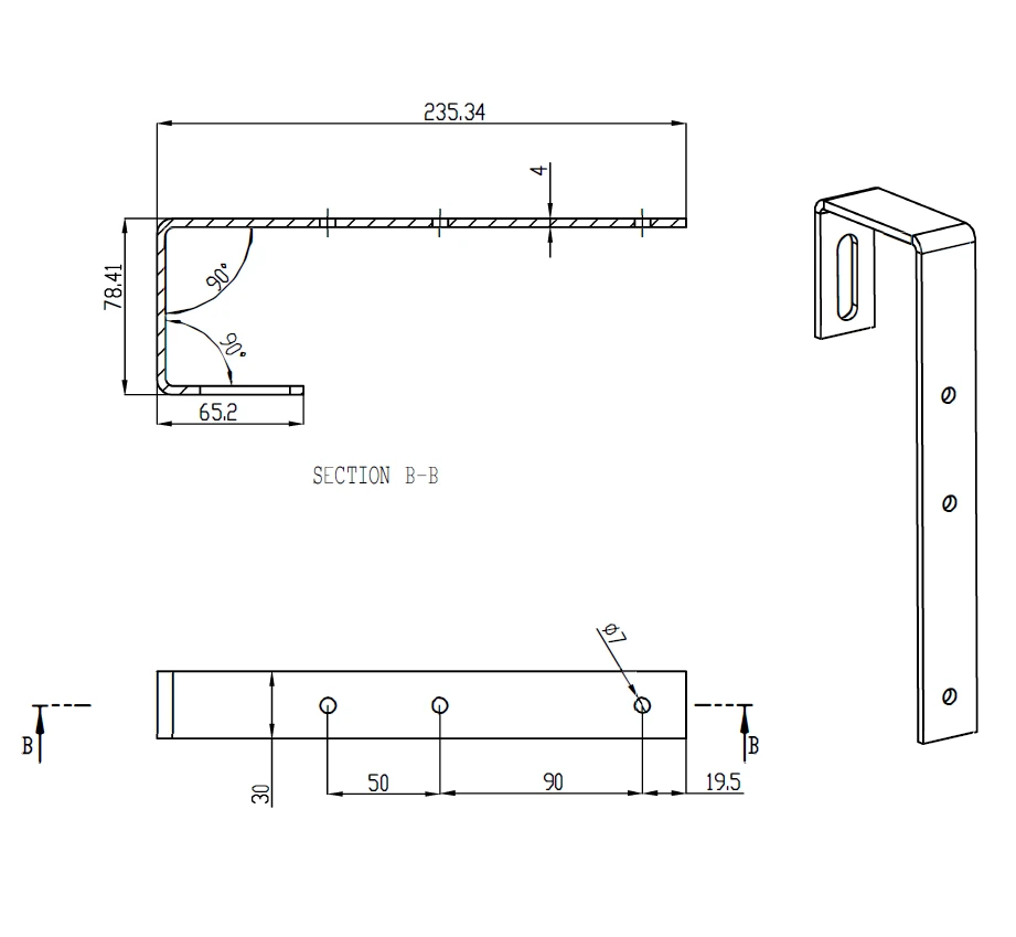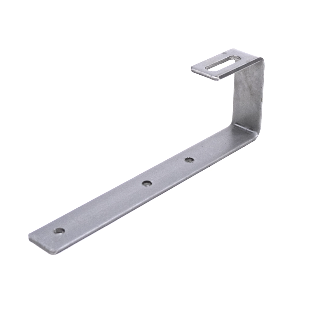 Crochet de Toit en J pour toitures en ardoise, fabriqué en acier inoxydable H17 1.4016, dimensions 239x30x4mm avec orifice M10 pour profilé destiné aux systèmes photovoltaïques.
