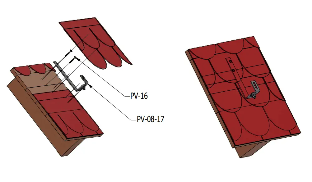 Support de toiture pour la fixation des rails de montage de panneaux photovoltaïques sur tuiles recouvertes d'ardoise ou bardeaux bitumineux. Absence de réglage nécessite une surface de toit plane. En cas de toits irréguliers, optez pour des crochets avec réglage simple.