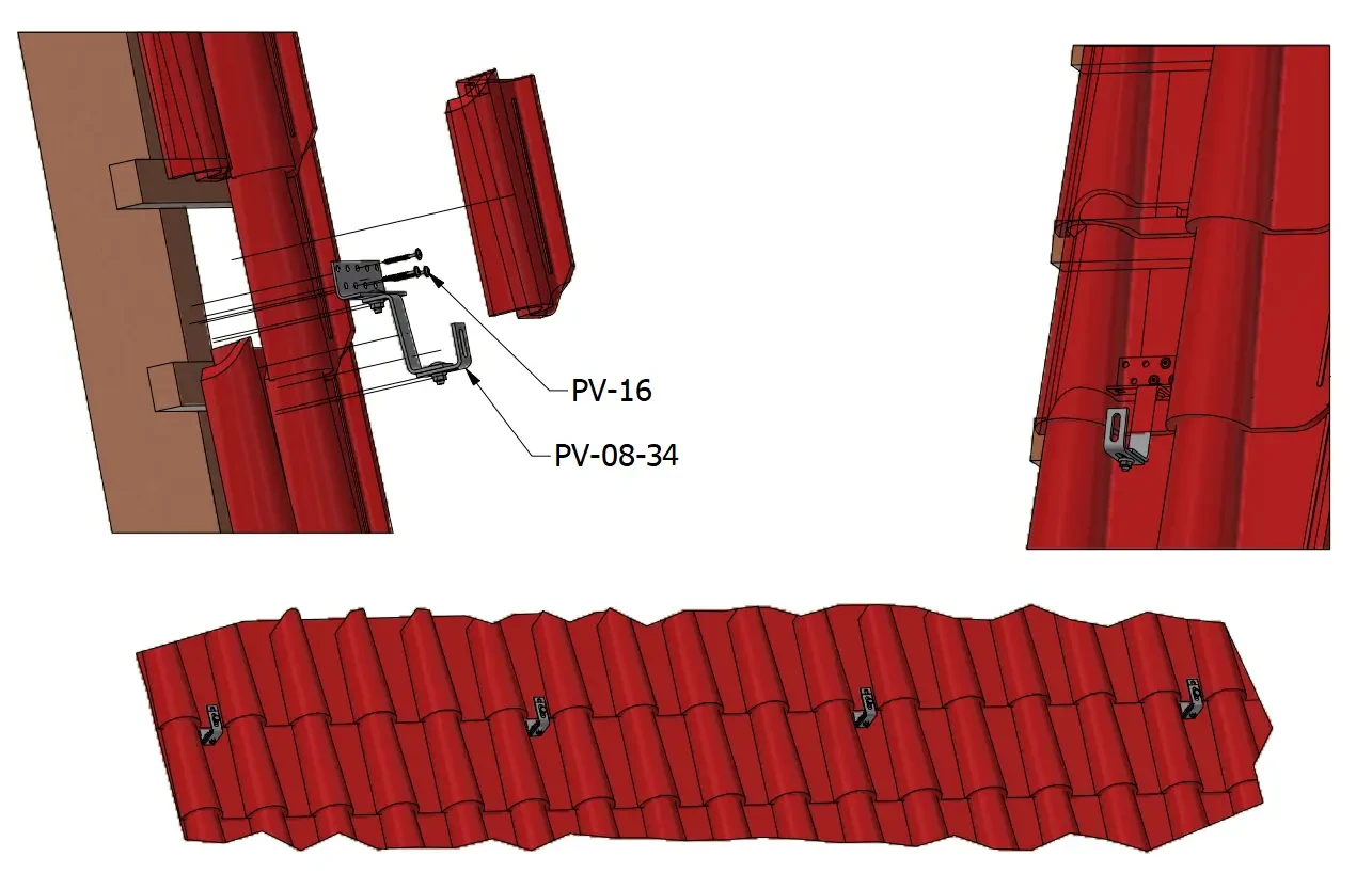 Crochet de toit Vario pour la fixation de profilés de systèmes photovoltaïques sur toitures couvertes de tuiles céramiques et béton. Assure la stabilité de l'ensemble de la construction.
