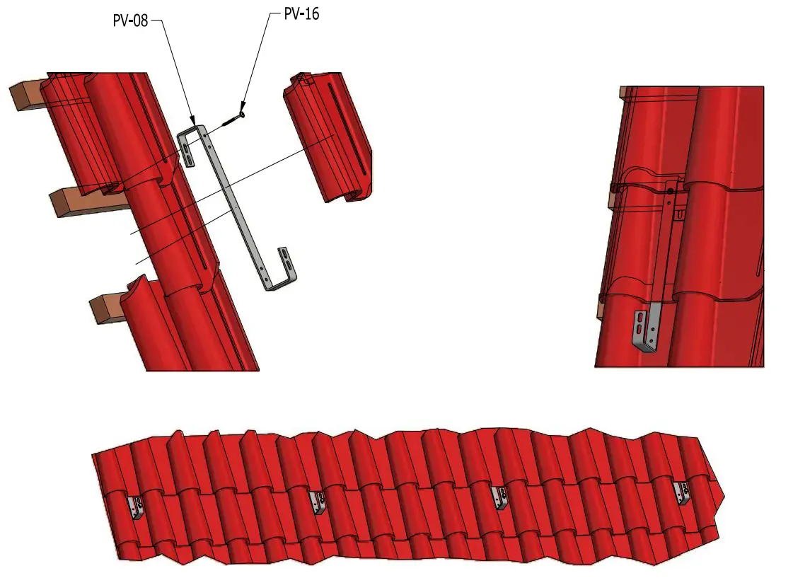 Le crochet S est conçu pour le montage de panneaux photovoltaïques sur une toiture couverte de tuiles en céramique ou en béton d'une épaisseur maximale de 60 mm. Le support permet de fixer des rails de montage de dimensions 40×40 mm sur un liteau d'une épaisseur maximale de 50 mm. Fabriqué en acier inoxydable, il garantit une protection contre les conditions atmosphériques défavorables. Dans la partie supérieure de l'élément se trouve un trou M7, pour une vis M6, qui permet de visser le support au liteau et d'augmenter la rigidité de la structure. Le trou oblong dans la tige permet d'ajuster le positionnement des rails de montage.