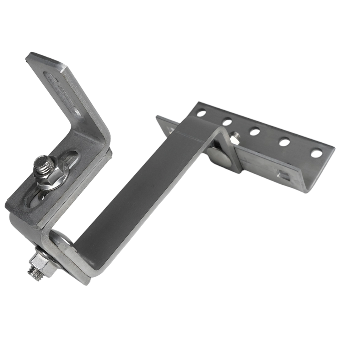 Crochet de Toit Vario 145 (4-5-5-5) à triple réglage, acier inoxydable 1.4016, dimensions 145x30x5/4mm avec trou M10 pour profilé destiné aux systèmes photovoltaïques avec cornière supplémentaire 30x5mm pour profilés montés latéralement.