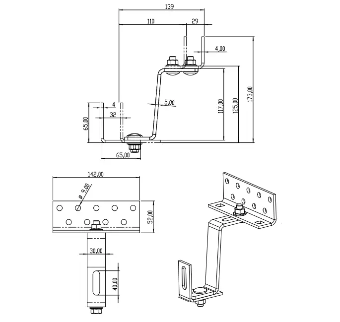 Permet la connexion des profilés à la couverture de toit. Le Crochet Vario se monte sur le canal inférieur du rail à l'aide d'une vis. Utilisé là où les crochets de toit standard (sans réglage) sont trop courts.