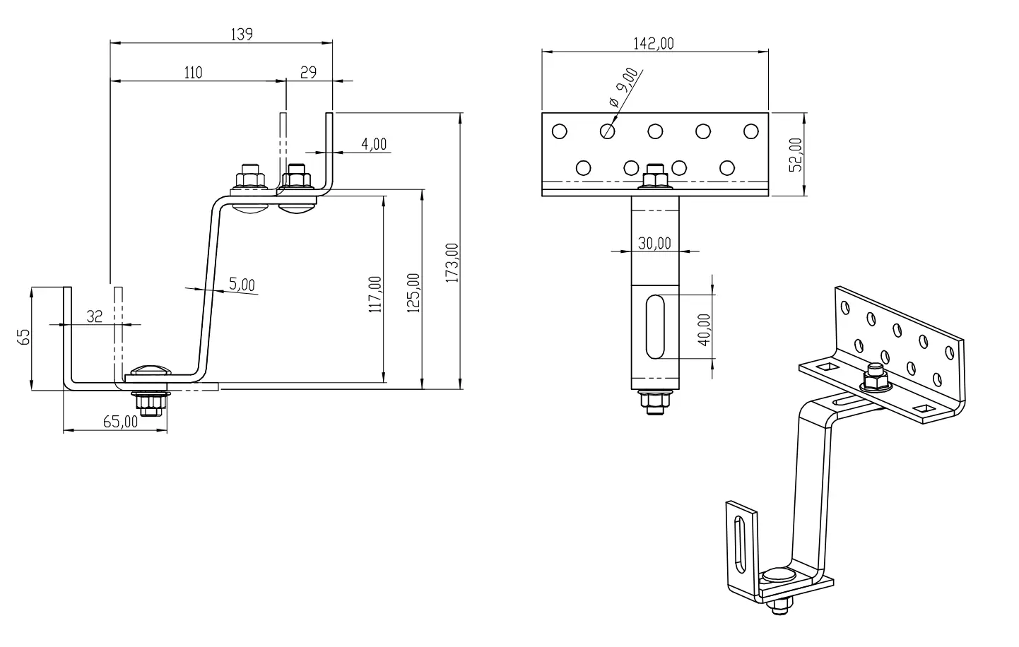 - La cornière large est réalisée en tôle de 5mm, le plat en Z de 30x5, et la cornière réglable a des dimensions de 30x4mm.