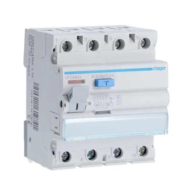 L'interrupteur différentiel 3P+N 40A 300mA type AC CFC440J de la marque HAGER est un dispositif qui protège contre les chocs électriques et est utilisé comme forme de protection supplémentaire (protection contre les contacts indirects), lorsque les mesures de protection de base échouent ou sont endommagées.