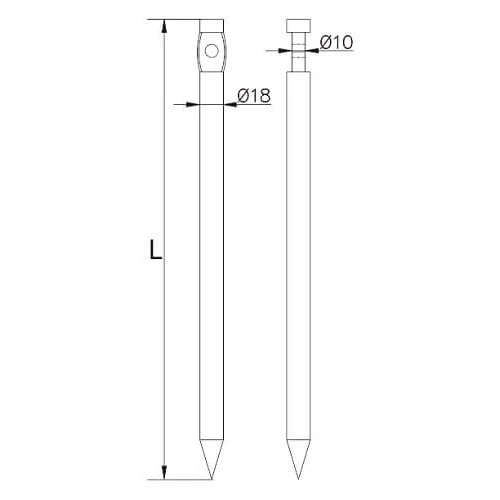 Het anker is bedoeld om in de grond te worden geslagen en dient als bevestigingspunt voor ronde geleiders met diameter Ø8 mm. De puntige tip vergemakkelijkt het inslaan zelfs in hardere ondergronden, en het montagegat maakt een veilige bevestiging van de bliksemafleider mogelijk.