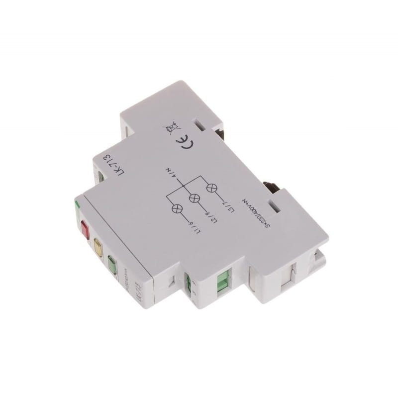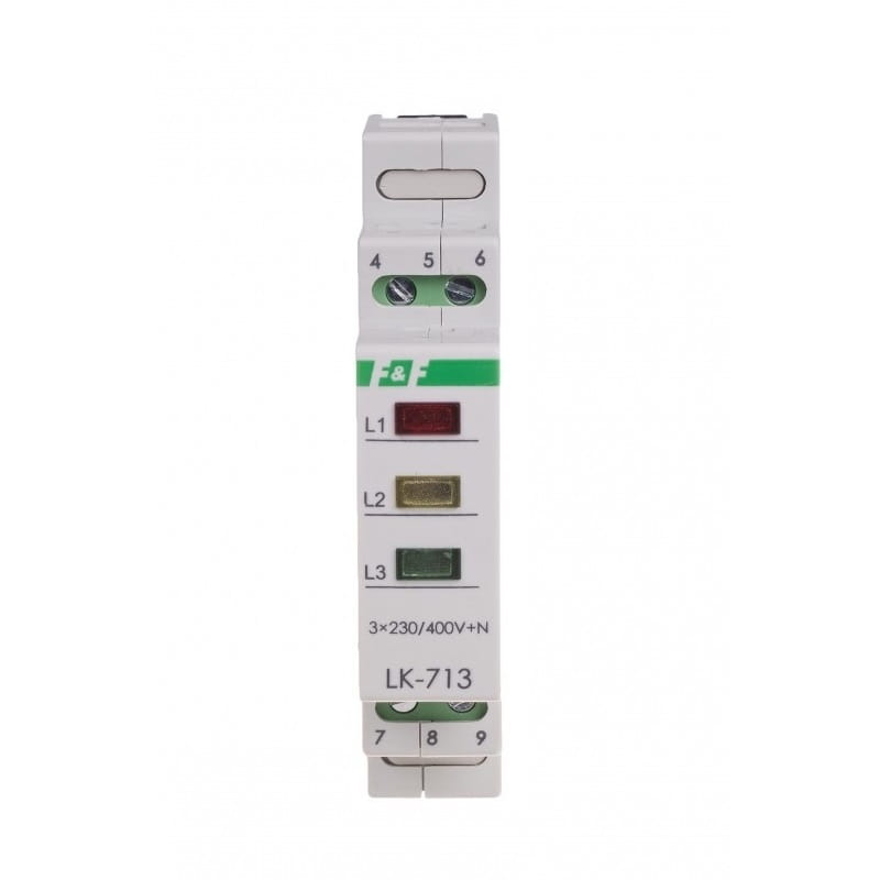 Controlelamp 3×230V+N 3xLED groen LK-713 G F&F FILIPOWSKI is ontworpen om de aanwezigheid van spanning op elk van de drie fasen van een driefasig netwerk optisch te signaleren. Als er spanning op een fase staat, gaat de bijbehorende groene LED branden. Het hele apparaat wordt gevoed door 3×230 V+N en bevat drie groene LED's.
