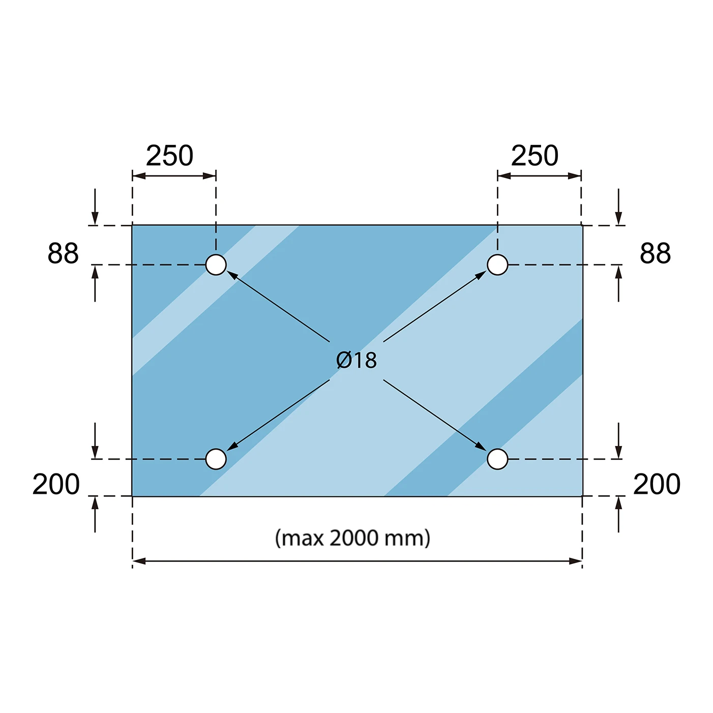 - Bovenste gaten (verbindingsstukken wand–glas): 88 mm vanaf de bovenrand, 250 mm vanaf de zijranden